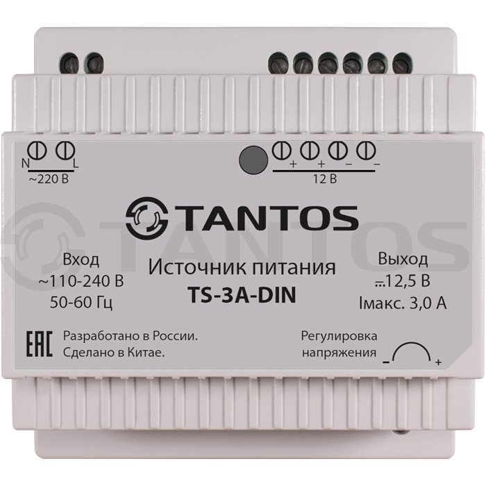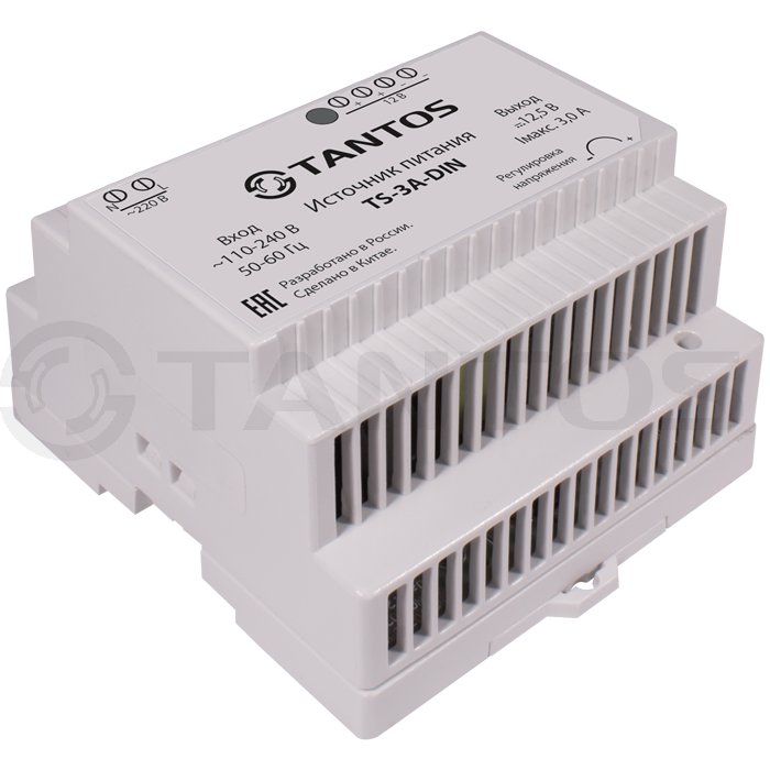 Источник стабилизированного питания 12В, 3А, встроенная защита от короткого замыкания нагрузки, перегрузки по напряжению и току. Установка источника питания производится на DIN-рейку