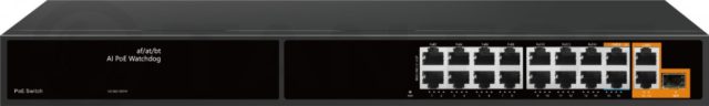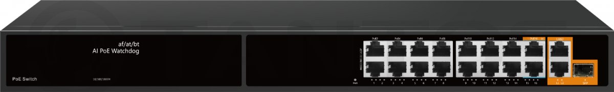 PoE коммутатор 15x100 Мбит/с PoE порта + 1 PoE порт 1000Мбит/с (14 портов 802.3af/at, максимальная мощность PoE 30Вт на порт, 2 порта 802.3af/at/bt, максимальная мощность PoE 60Вт на порт) + 2x1000 Мбит/с порта Uplink + 1 SFP 1000Мбит/с порт, общий бюджет PoE 300 Вт, автоматический PoE watchdog