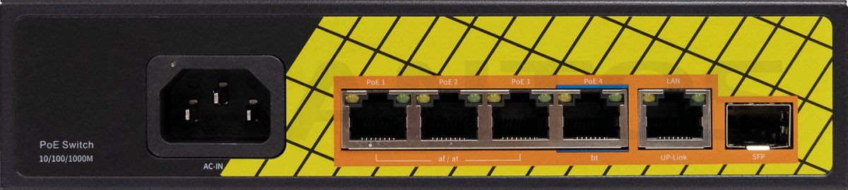 PoE коммутатор 4x1000 Мбит/с PoE порта + 1 порт 1000Мбит/с (3 порта 802.3af/at, максимальная мощность PoE 30Вт на порт, 1 порт 802.3af/at/bt, максимальная мощность PoE 60Вт на порт) + 1x1000 Мбит/с порт Uplink+ 1 SFP 1000Мбит/с порт, общий бюджет PoE 65 Вт, автоматический PoE watchdog, встроенный блок питания