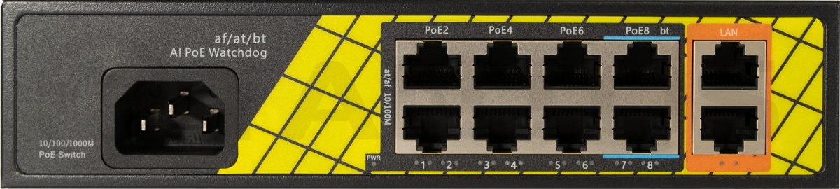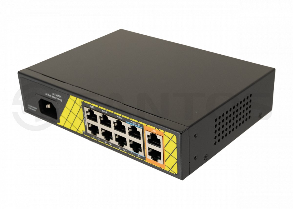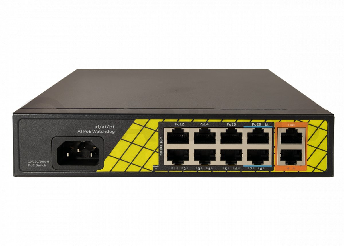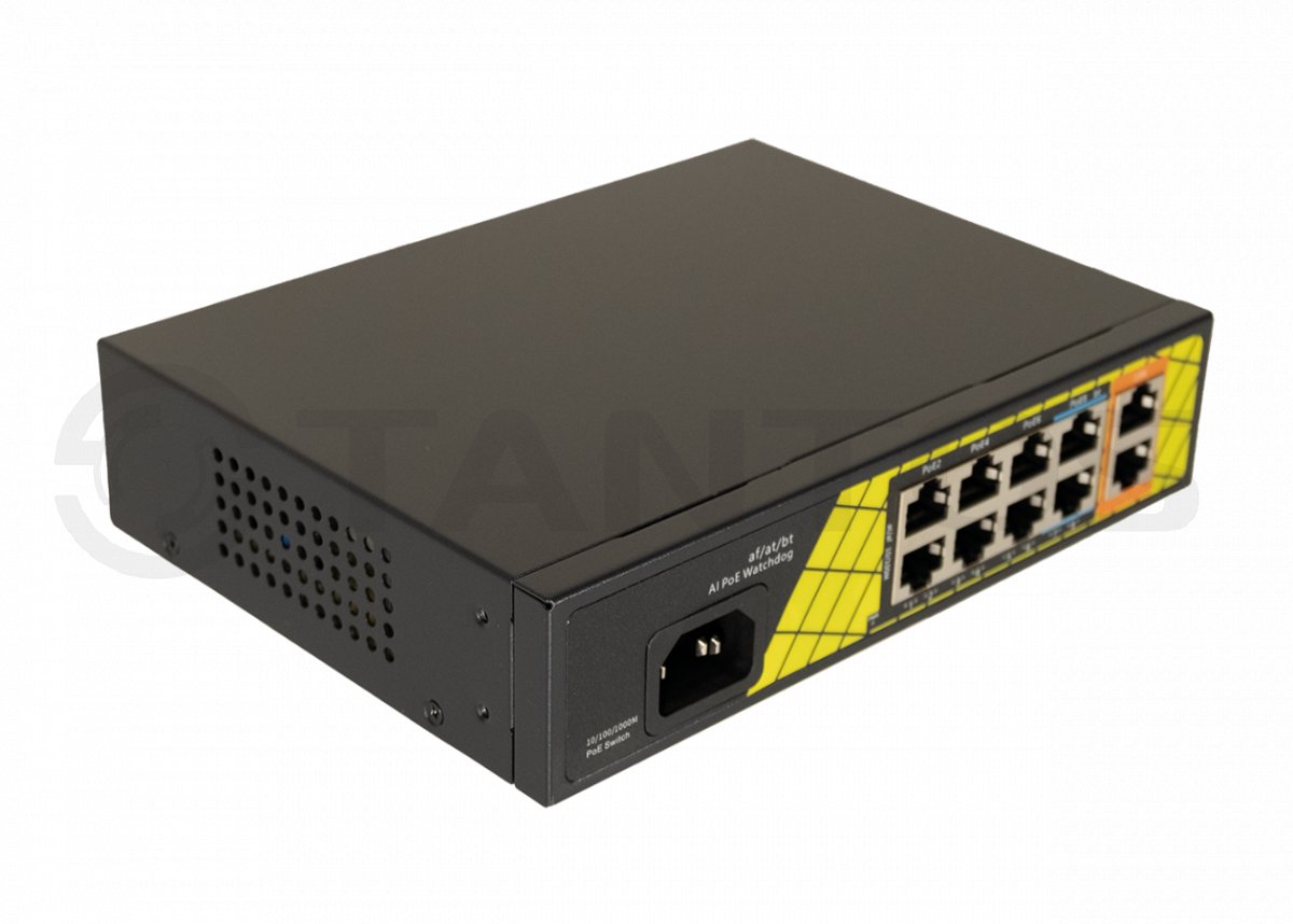 TSn-8FP10G2 - PoE коммутатор 8x100 Мбит/с PoE портов (6 портов 802.3af/at, максимальная мощность PoE 30Вт на порт, 2 порта 802.3af/at/bt, максимальная мощность PoE60Вт на порт) + 2x1000 Мбит/с порта Uplink, общий бюджет PoE 120 Вт, автоматический PoE watchdog, встроенный блок питания